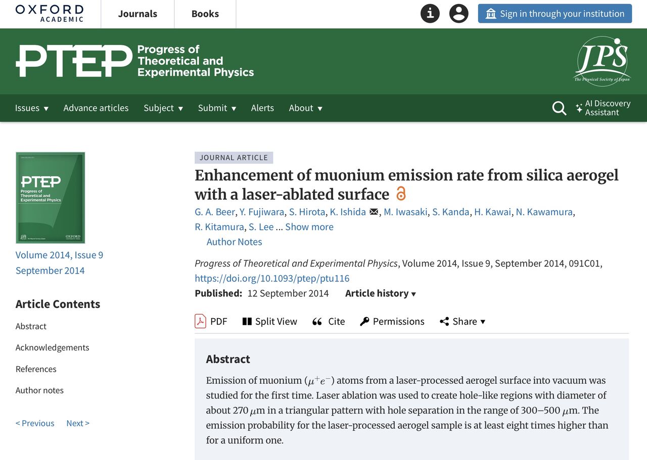 奈良林氏が「このオックスフォードプレスから出版された正規の査読を経た論文」として挙げている技術論文:“Enhancement of muonium emission rate from silica aerogel with a laser-ablated surface”で、その要約 Abstractが以下です。